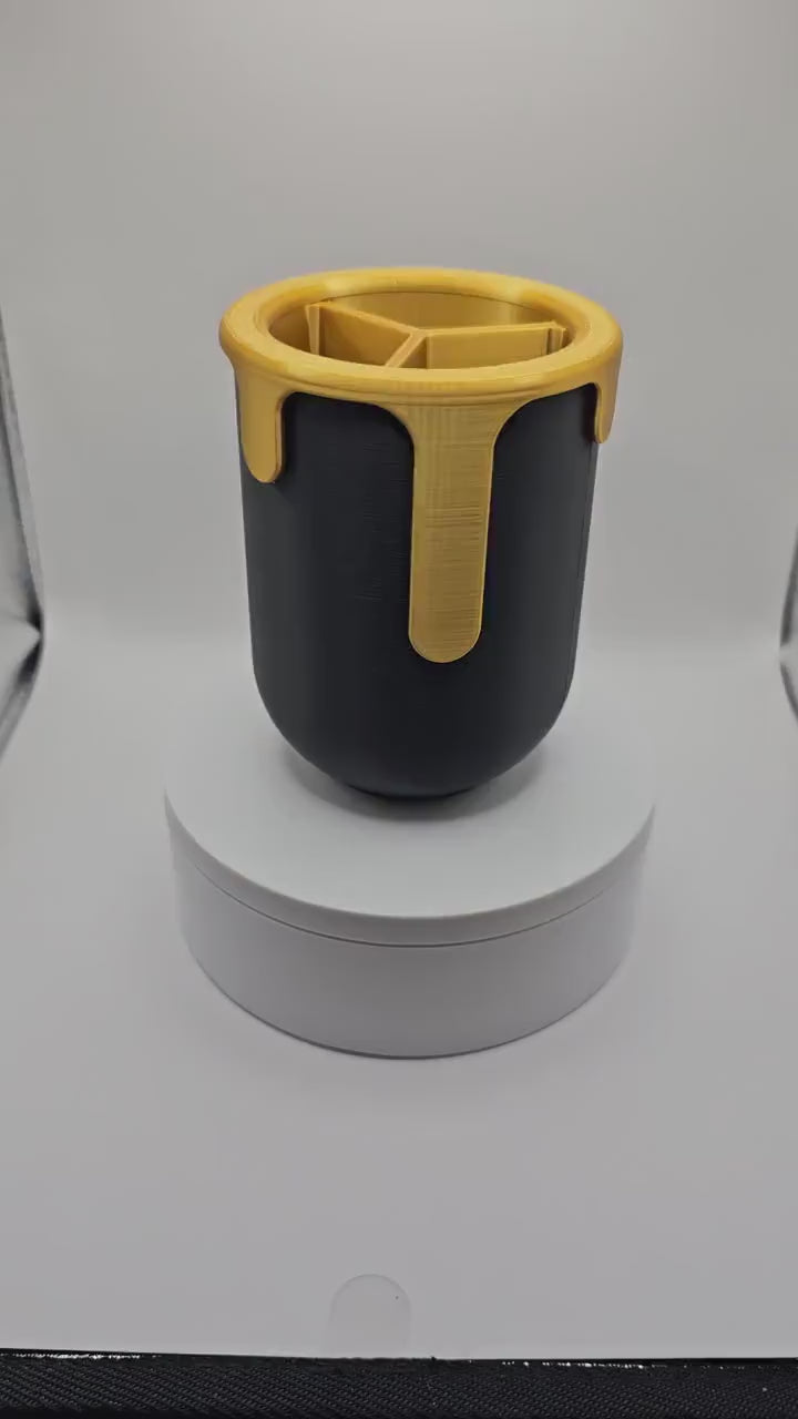 Introducing our vibrant 3D printed pen and pencil cup, designed with an eye-catching overflowing paint detail that effortlessly enhances any workspace. Crafted from high-quality plastic, this unique cup stands approximately 4 inches tall and has a diameter of 3 inches, making it a perfect fit for your desk or art studio. You can opt for a version with no dividers or choose between one to two dividers to keep your writing instruments and tools organized.